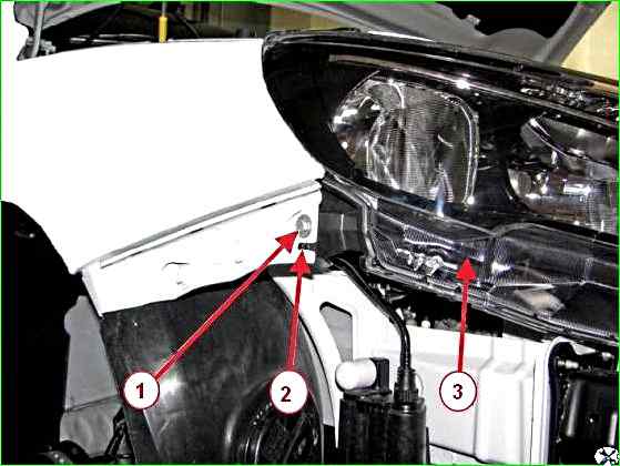 Крутящий момент затяжки болтов 1, рисунки 1 и 2, крепления фары 3÷5 Нм (0,3÷0,5 кгс.м).