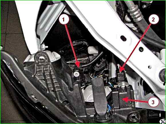 Отсоединяем колодки 1 и 2, рисунок 3, жгута проводов от блок-фары 3 и снимаем блок-фару.