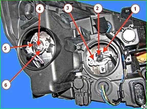 Колодки жгутов проводов к блок-фаре: 1 – колодка жгута проводов к корректору света фар; 2 – колодка жгута проводов к лампам накаливания; 3 – блок-фара