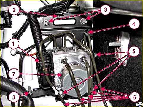 Отсоединяем штекерную колодку 1, рисунок 1, жгута проводов переднего от гидроагрегата 7 АБС.