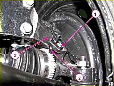 С помощью сменной насадки Torx Т30 отворачиваем винт 1, рисунок 2, крепления датчика скорости и извлекаем датчик 2 скорости из отверстия на поворотном кулаке 3.