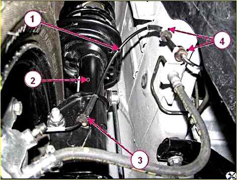 Устанавливаем жгут 1, рисунок 5, проводов датчика скорости в паз кронштейна 2 и скобу крепления на рычаге задней подвески, в паз кронштейна 3 и скобу 4 крепления на кузове.