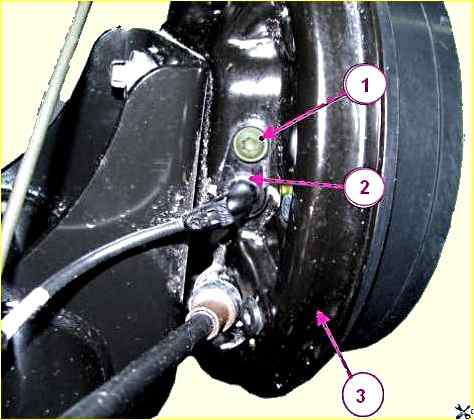 С помощью насадки Torx Т30 отворачиваем винт 1, рисунок 4, крепления датчика 2 скорости к щиту 3 заднего тормоза и извлекаем датчик.