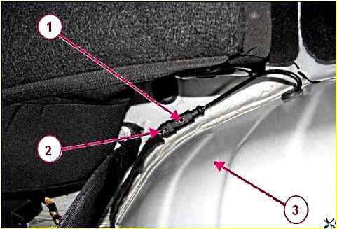 Заводим разъем 1, рисунок 6, жгута проводов датчика скорости в отверстие в арке 3 заднего колеса и подсоединяем к фиксатору на кузове и разъему 2 жгута проводов заднего.