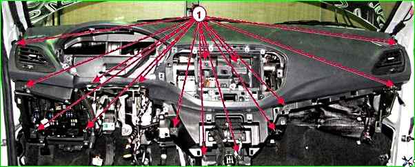 Отворачиваем пятнадцать винтов 1, рисунок 5, крепления каркаса панели приборов к поперечине панели приборов, снимаем каркас панели приборов с поперечины, извлекаем из салона автомобиля.