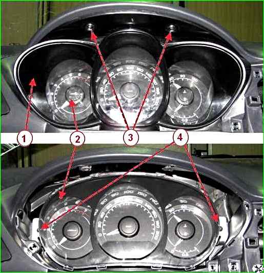 Отворачиваем винты 4 крепления комбинации 2 приборов, снимаем комбинацию приборов, отсоединив от нее колодку жгута проводов панели приборов.