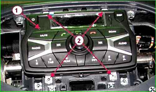 Отворачиваем винты 2, рисунок 3, крепления проигрывателя 1 мультимедийной системы, извлекаем проигрыватель из панели приборов, отсоединив кабели и колодки жгута проводов панели приборов от проигрывателя.