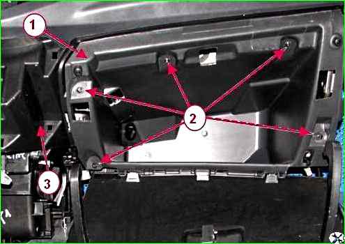 Головкой Torx 20 отворачиваем пять винтов 2, рисунок 4, крепления вещевого 1 ящика к панели 3 приборов, снимаем вещевой ящик.