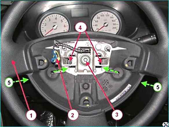 Отводим подушку безопасности от рулевого колеса и отсоединяем жгут проводов 2 от подушки безопасности.
