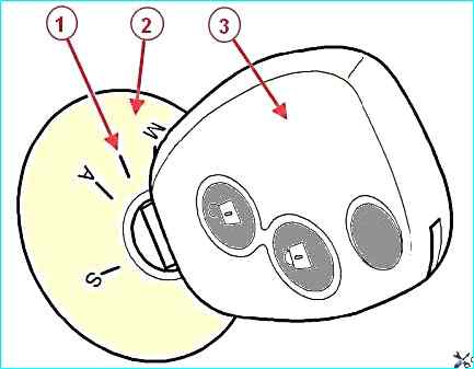Устанавливаем ключ 3, рисунок 4, выключателя зажигания в положение 1, утапливаем фиксаторы 3, рисунок 3, и снимаем замок 2 зажигания.