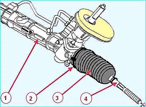 Снятие защитного чехла внутреннего шарнира рулевой тяги: 1 - рулевой механизм; 2 - хомут крепления защитного чехла; 3 - чехол защитный внутреннего шарнира рулевой тяги; 4 - рулевая тяга