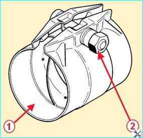 Выставить выпускной трубопровод до соприкосновения с выступами внутри ремонтной муфты и затянуть гайки 2 стяжных болтов муфт 1, соединяющих трубопроводы. Момент затяжки гаек стяжных болтов 25 Нм (2,5 кгс.м).