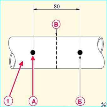 В случае если система выпуска цельная, то на трубопроводе 1, рисунок 4, системы выпуска отработавших газов, отмечаем маркером середину (В) между метками (А) и (Б) зоны резки, как показано на рисунке.