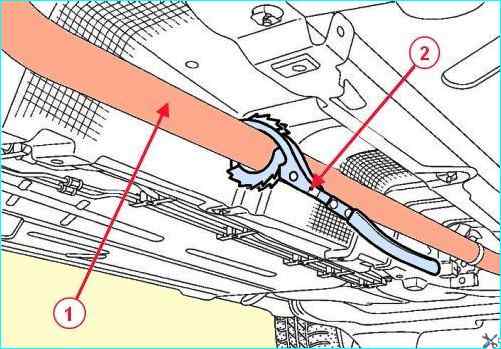 Резка трубопровода системы выпуска отработавших газов: 1 – система выпуска отработавших газов; 2 – труборез