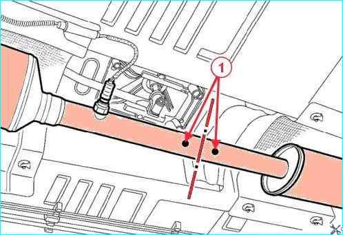 Разрезаем трубопровод системы выпуска отработавших газов между дополнительным и основным глушителями в соответствии с разметкой посередине между двумя метками 1, рисунок 7.
