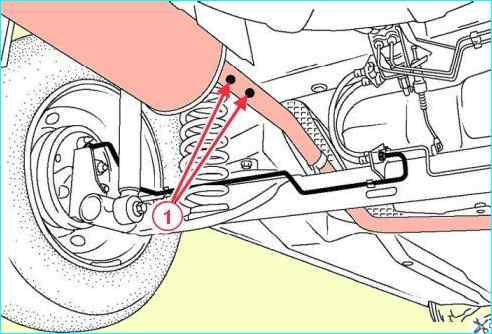 Поднять гидравлическую стойку с рычагами 1, рисунок 8, задней подвески, присоединить амортизаторы 3 к рычагам задней подвески, установить новые болты 2.