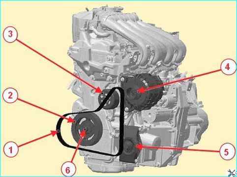 Снимаем ремень 1, рисунок 1, привода вспомогательных агрегатов, проворачивая с помощью головки на 19 демпфер 2 коленчатого вала за болт 6 крепления по часовой стрелке и направляя ремень плоской отверткой, осторожно, стараясь не повредить ремень и шкив.