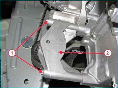 Головкой на 10 откручиваем два болта 1, рисунок 1, крепления и снимаем опорный ролик 2 в сборе ремня привода навесных агрегатов.