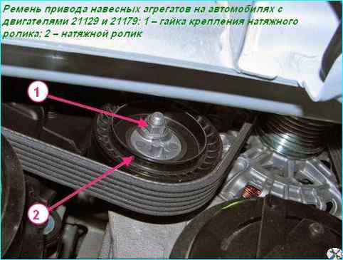 Головкой на 13 откручиваем гайку 1, рисунок 2, крепления натяжного ролика и снимаем натяжной ролик 2.