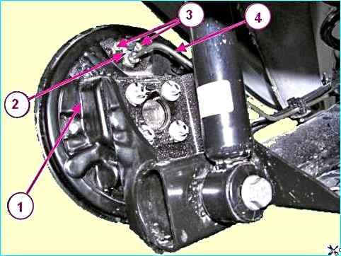 Отворачиваем штуцер крепления тормозной трубки 4, рисунок 1, к колесному цилиндру 2 заднего тормоза и устанавливаем заглушки на тормозную трубку и в отверстие колесного цилиндра.