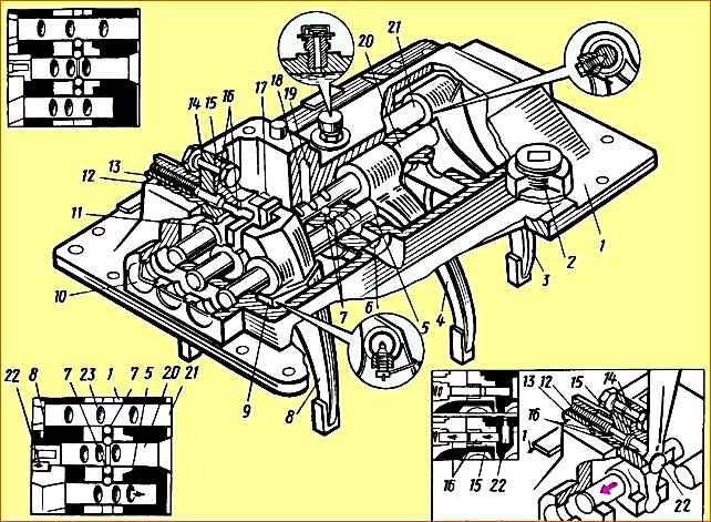 Штоки 5, 20 и 21 передвигаются в направляющих опорах верхней крышки с помощью рычага 22. На штоке заднего хода и штоке переключения первой и второй передач основной коробки имеются головки (соответственно 11 и 17).
