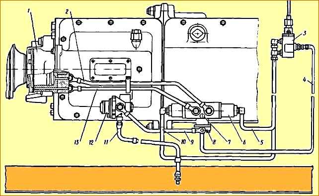 Механизм переключения дополнительной коробки (рис. 4) - Состоит из редукционного клапана 12, воздухораспределителя 6, пневмокрана 5, впускного клапана 8, рабочего цилиндра 1 и воздухопроводов.