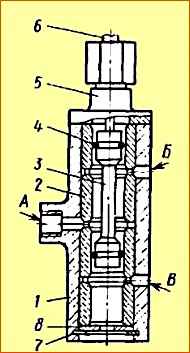 При поднятом переключателе диапазонов 1 (см. рис. 2) трос 6 перемещает золотник 3 (рис. 6) в положение, при котором сжатый воздух, подводимый от редукционного клапана к каналу «А» через канал пневмокрана, поступает в канал «Б» и далее к воздухораспределителю на включение понижающей передачи.