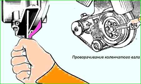 Продолжая вращать коленчатый вал, провернуть его еще примерно на ⅓ оборота (120°). Это положение коленчатого вала соответствует такту сжатия в первом цилиндре и оба клапана этого цилиндра будут закрыты.