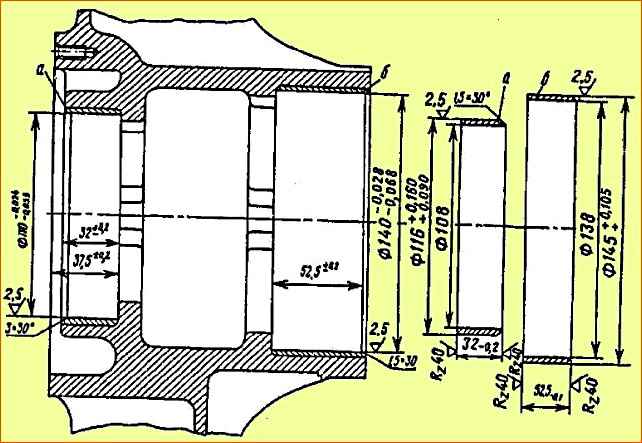 Износ шеек под подшипники допускается: под наружный подшипник до диаметра 49,94 мм (рис. 1, 5). под внутренний до диаметра 69,93 мм.