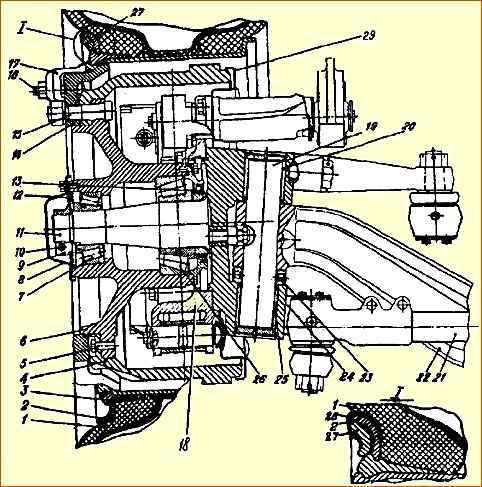 - - проворачивая ступицу, затяните гайку 9 до тугого вращения ступицы крутящим моментом 24 кгсм, после чего отверните гайку на 80—90 градусов;