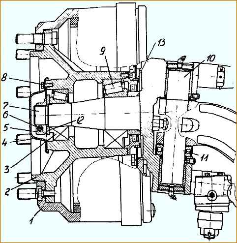- - снимите крышку 8 и ослабьте гайку 9 подшипника, отвернув болт 10. Поворачивая ступицу, проверьте легкость ее вращения. В случае тугого вращения, выясните причину, при необходимости снимите ступицу;