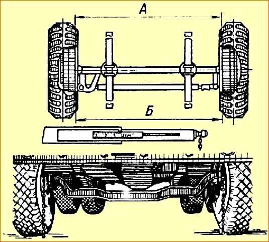 Величина схождения колес замеряют специальной линейкой модели 2182 и определяется разностью расстояний между торцами тормозных барабанов в горизонтальной плоскости.
