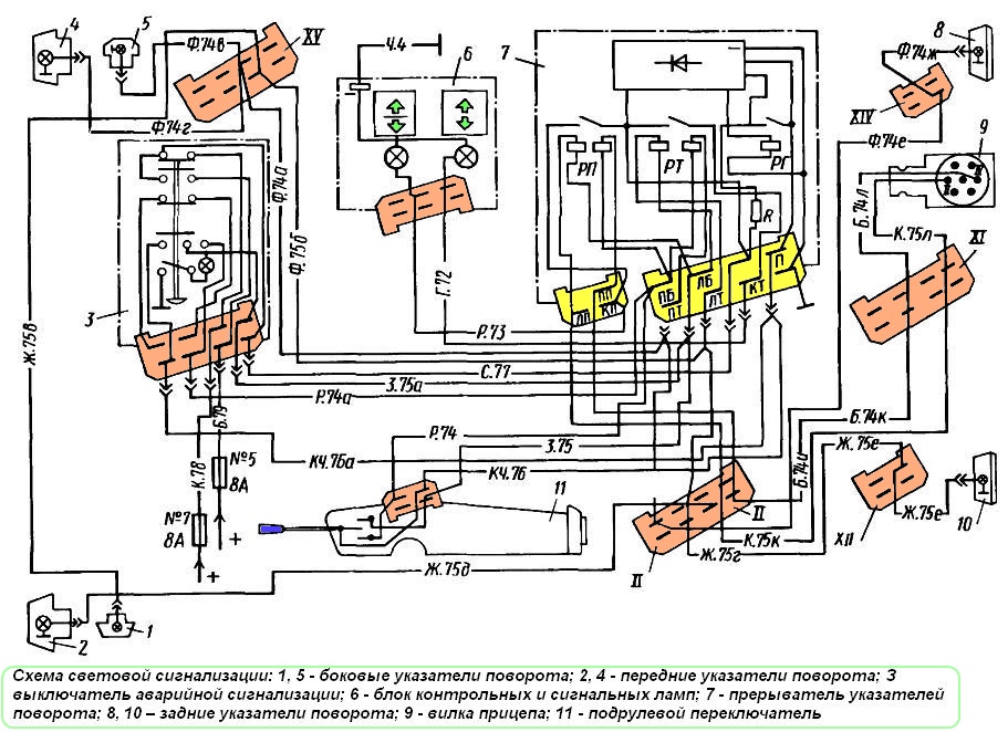 С клеммы «ЛТ» ток поступает по желтому проводу на штекерный соединитель ХV и с него по желтому проводу на левый боковой повторитель тягача и одновременно с клеммы «ЛТ» по желтым проводам на штекерные соединители II и ХIII и через них к переднему и заднему левым указателям поворота тягача.