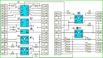 - F16(10) Реле-прерыватель указателей поворотов и аварийной сигнализации (в режиме аварийной сигнализации)
