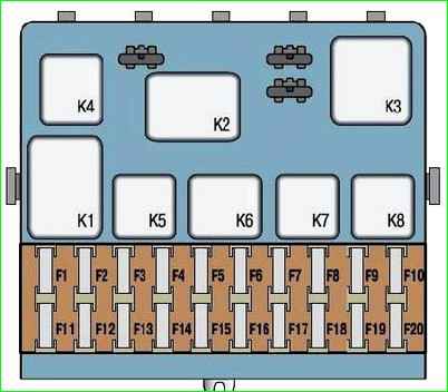 Предохранители и реле установлены в блоке (рис. 1), который находится в салоне автомобиля под панелью приборов с левой стороны от рулевой колонки.