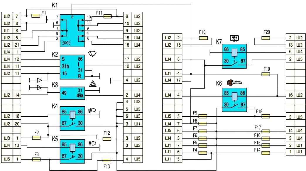 - F9(20) Выключатель обогрева стекла двери багажного отделения, реле очистителя ветрового стекла, электродвигатель очистителя ветрового стекла, насос омывателя ветрового стекла, правый подрулевой переключатель, лампа освещения вещевого ящика, лампы света заднего хода