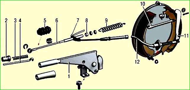 Стояночный тормоз имеет механический привод от рычага 1 (рис.1).