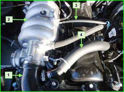 Картерные газы по вытяжному шлангу поступают в маслоотделитель, расположенный на блоке цилиндров.