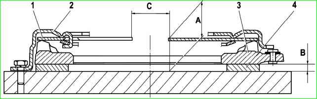 Закрепите нажимной диск 3 (рис. 7) в сборе с нажимной пружиной 1 и кожухом 2 на приспособление с промежуточным кольцом 4 толщиной B=(8,3+0,01) мм.