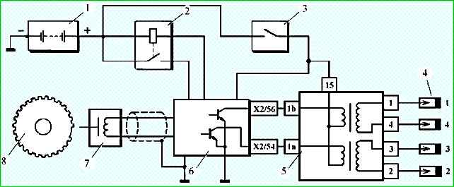 Контроллер коммутирует на массу цепь первичной обмотки катушки зажигания, выдающей высокое напряжение на свечи зажигания цилиндров 2, 3.