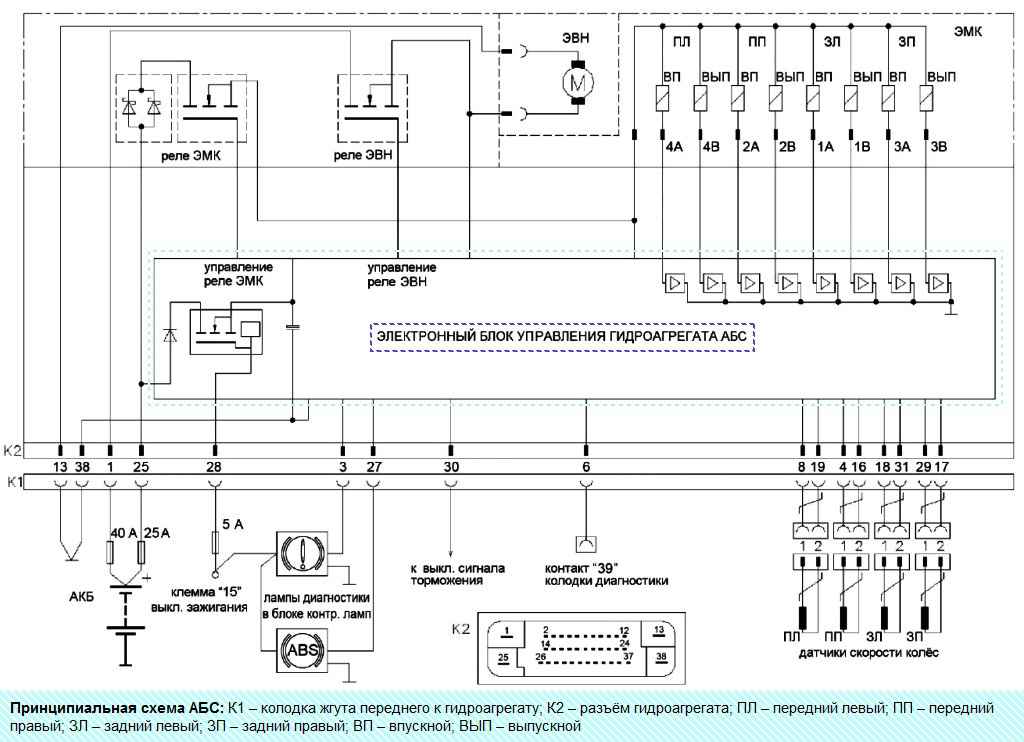 Электронный блок управления производит логическую обработку сигналов о скорости колес и, в зависимости от их состояния (чрезмерное ускорение или замедление колеса), направляет управляющие команды к гидромодулятору.