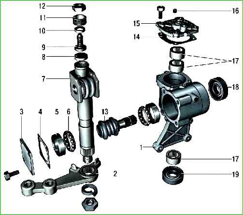 Извлеките из картера 1 сальник 18 вала червяка и сальник 19 вала сошки.