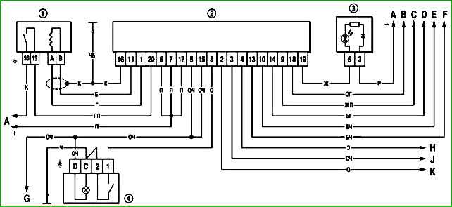 Схема соединений автомобильной противоугонной системой: 1 - выключатель зажигания; 2 - блок управления АПС; 3 - блок контрольных ламп; 4 - выключатель задних противотуманных огней; А - к источникам питания; В - к контроллеру, контакт «55»; С - к колодке диагностики; D к выключателю в стойке двери водителя; Е - к выключателям в стойках дверей; F - к выключателю наружного освещения (включение габаритных огней); G - к лампам противотуманного огня в задних фонарях; Н - к выключателю наружного освещения (включение света фар); J - к выключателю противотуманных фар; К - к реле электростеклоподъемников (клемма «85»)