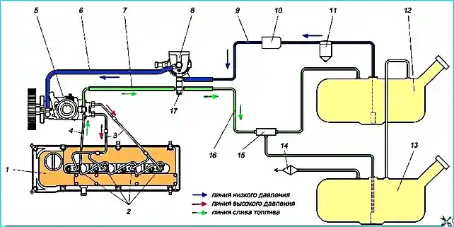 Схема системы питания дизельного двигателя ЗМЗ-5143.10 на автомобилях УАЗ с электрическим топливным насосом: 1- двигатель; 2 форсунки; 3 топливопроводы высокого давления двигателя; 4 шланг отвода отсечного топлива от форсунок к ТНВД; 5 - ТНВД; 6 - шланг подвода топлива от фильтра тонкой очистки к ТНВД; 7 - шланг слива топлива от ТНВД к штуцеру фильтра тонкой очистки; 8 – фильтр тонкой очистки; 9 - топливопровод забора топлива от баков; 10 - топливный электронасос; 11 - фильтр грубой очистки топлива; 12 - правый топливный бак; 13 - левый топливный бак; 14 - клапан топливного бака; 15 - струйный насос; 16 - топливопровод слива топлива в баки; 17 - перепускной клапан