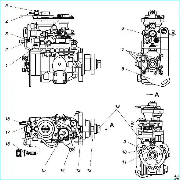 Топливный насос высокого давления BOSCH типа VE: 1 - электромагнитный клапан остановки двигателя; 2 - винт регулировки максимальных оборотов холостого хода; 3 регулировочный винт максимальной подачи топлива (опломбирован и при эксплуатации не регулируется); 4 - штуцер корректора по наддуву воздуха; 5 корректор по наддуву воздуха; 6 винт регулировки минимальных оборотов холостого хода; 7 - штуцера топливопроводов высокого давления; 8 - кронштейн крепления ТНВД; 9 - фланец крепления ТНВД; 10 - отверстие корпуса ТНВД для установки штифта-центратора; 11 - паз ступицы под штифт-центратор ТНВД; 12 ступица шкива ТНВД: 13 - штуцер подвода топлива; 14 рычаг подачи топлива; 15 - датчик положения рычага подачи топлива; 16 - разъем датчика; 17 - штуцер подвода отсечного топлива от форсунок; 18 - штуцер отвода топлива в линию слива; 19 - гайка крепления ступицы на валу ТНВД