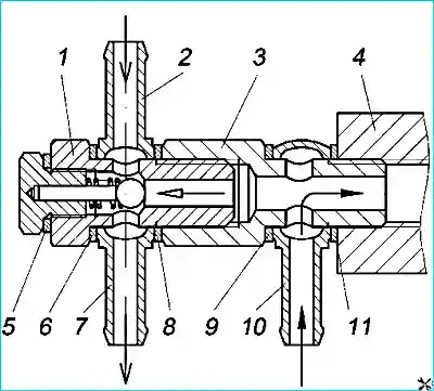 Перепускной клапан: 1 - перепускной клапан; 2 - штуцер подвода отсечного топлива от ТНВД; 3 - полый штуцер к фильтру; 4 - фильтр тонкой очистки топлива; 5, 6, 8, 9, 11 - уплотнительные прокладки; 7 - штуцер отвода топлива в линию слива; 10 - штуцер подвода топлива от баков