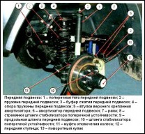 Передняя подвеска автомобиля UAZ Patriot зависимая, состоит из двух шаровых шкворней с каждой стороны, двух продольных штанг, одной поперечной тяги, витых цилиндрических пружин, гидравлических телескопических амортизаторов и стабилизатора поперечной устойчивости