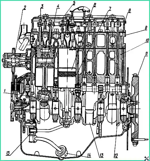 Продольный разрез двигателя: 1 - форсунка охлаждения поршней; 2 - водяной насос; 3 - палец поршневой; 4 - шатун; 5 - колпак; 6 - поршень; 7- гильза цилиндров; 8 - крышка головки цилиндров; 9 - головка цилиндров; 10 - блок цилиндров; 11 - маховик; 12 - противовес коленчатого вала; 13 - вал коленчатый; 14 - маслоприемник; 15 - насос масляный