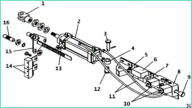 Пневмопривод дверей (ОАО "Мичуринский завод "Прогресс"): 1 - вилка цилиндра; 2 - цилиндр; 3 - палец крепления цилиндра; 4 - болт откидной; 5 - блок резисторов; 6 - электронный блок У33А; 7 - диодная сборка; 8 - пневмораспределитель; 9 - кнопка экстренного открывания двери; 10 - электромагнит; 11 - шланг; 12 - втулка болта; 13 - датчик щелевой; 14 - микропереключатель; 15 - кронштейн упоров с рейкой; 16 - упор
