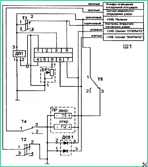 При открывании двери или в её закрытом положении микропереключатели, установленные на пневмоцилиндре, соответственно замыкают или размыкают цепи контрольной лампы открытого положения и освещения посадочной площадки.